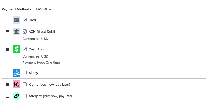 - Accept Multiple Payment Methods: Offer preferred payment methods to expand your reach and broaden your customer base. Payment methods include Cash App Pay, Apple Pay / Google Pay / Microsoft Pay, ACH Direct Debit, Credit and Debit Cards, Alipay, and more.