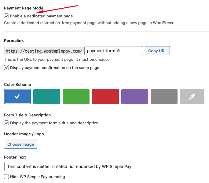 As soon as you click on the checkbox, you’ll be prompted to specify the URL for your payment page, a color scheme for the background, and a header image or logo. You can also choose to show or hide your payment form’s title and description on the page.