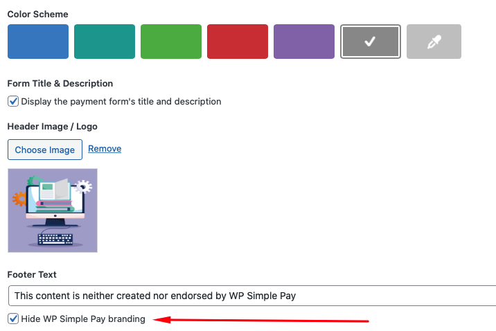 If you decide you want to remove the WP Simple Pay branding from the landing page, you always have the option to check the box next to Hide WP Simple Pay branding in the Payment Page editor.