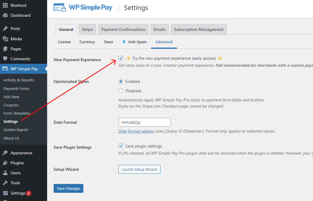 You can easily do this in your WordPress dashboard by navigating to WP Simple Pay » Settings » Advanced and selecting the New Payment Experience checkbox.