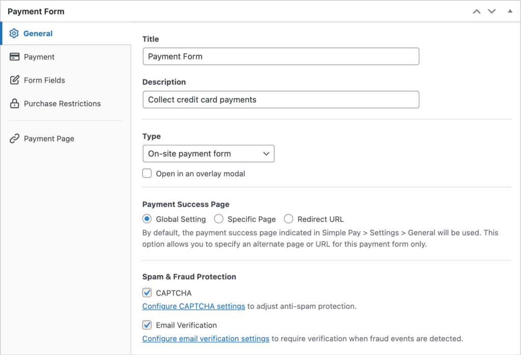 In the General tab, you can change the title, description, and form type. You can also enable spam and fraud protection features including CAPTCHA and email verification.