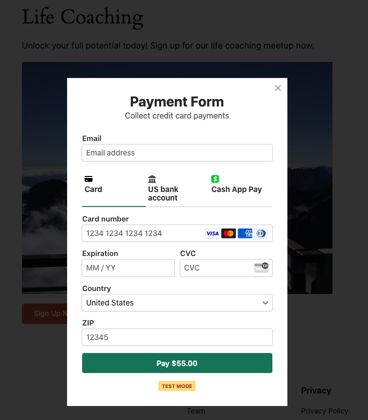 When you view your page and test the payment button, it should display as an overlay modal so that your customers can complete their transactions right on the page.