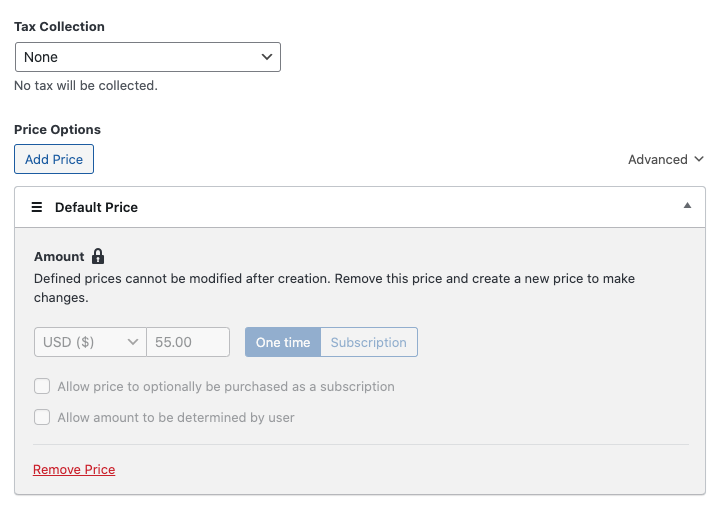 Next, in the Payment tab, add your price amount and select One time. You can also check the boxes next to each of the payment methods you want to offer.