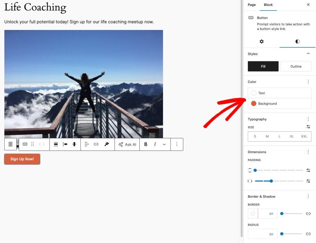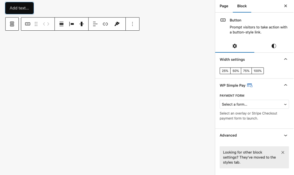 Using the “Button” block, you can customize the style and appearance of the payment button, including its width, text, and color options.