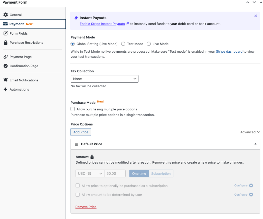 Next, click on the Payment tab. You can customize the currency and pricing amounts and even choose between one-time and subscription payments.