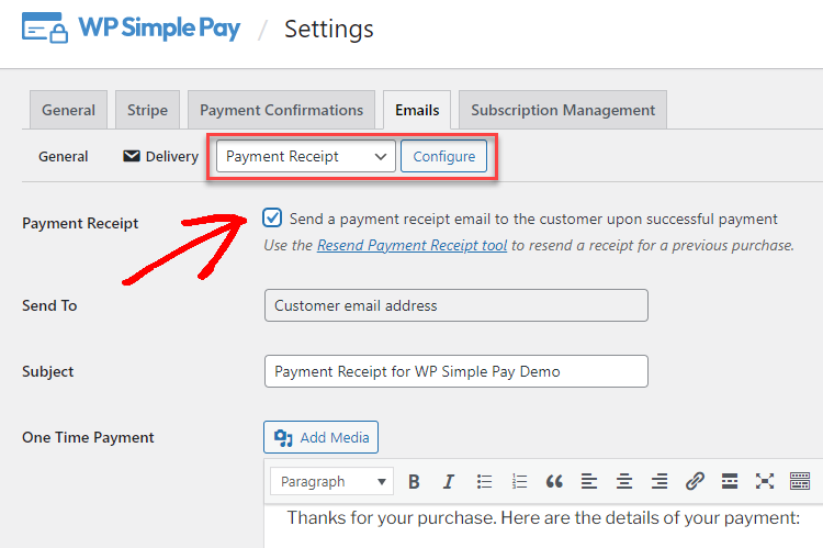 With WP Simple Pay, you can customize the emails the way you want and send emails in HTML format. To send emails in rich text, you can use the free WP HTML Mail plugin.