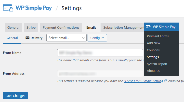 Now that you’ve installed the plugin and connected it with Stripe, let’s start configuring your Stripe email receipts. WP Simple Pay lets you set up 4 different email options. No matter how many emails you set up, you’ll be using the same From Name and From Address.