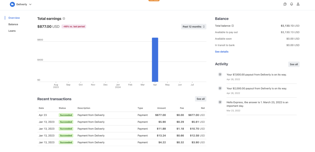 Once you’ve enabled Instant Payouts from your Stripe dashboard, you’ll be able to see recent payouts and transactions in the Overview tab.