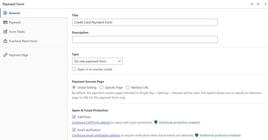 The General tab is also where you can enable your spam and fraud protection settings, including email verification and CAPTCHA.