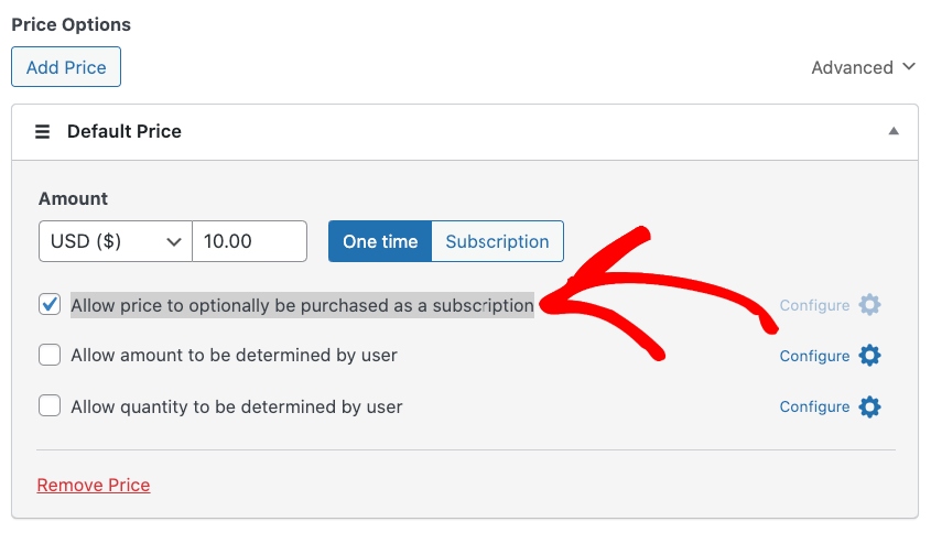 For the price amounts that you want to offer as a subscription, be sure to check the box next to “Allow price to optionally be purchased as a subscription.”