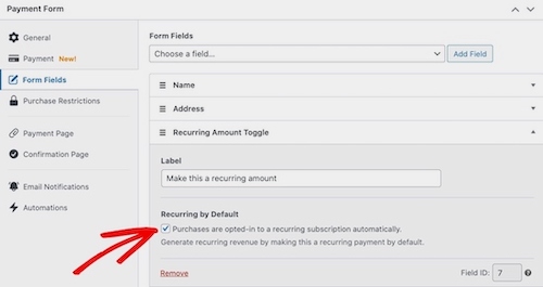 Then, move on to the Form Fields tab. Here, you’ll need to choose the Recurring Amount Toggle from the dropdown menu.