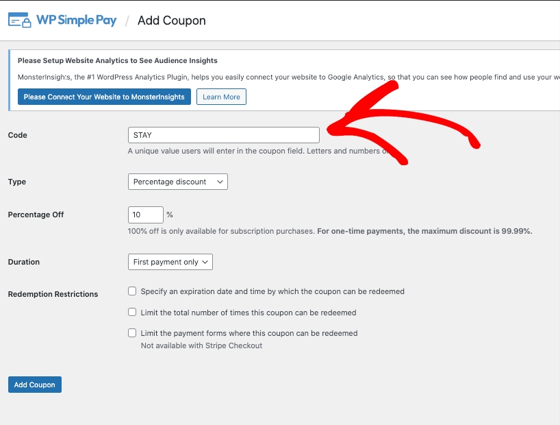 Custom discount codes can be easily created from your WordPress admin dashboard. Simply navigate to the Coupons tab to create the code you’d like to send in your recovery email.