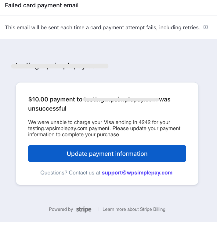 Another great feature of WP Simple Pay is that it is powered by Stripe, which works on your behalf to help recover failed recurring payments automatically by retrying the transaction. If that doesn’t work, it notifies you and the customer about the issue.