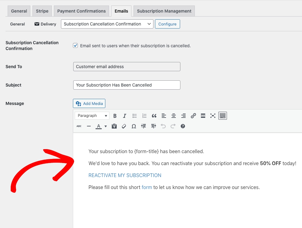 If you have to cancel a customer’s subscription due to failed recurring payment attempts, WP Simple Pay lets you send them a customized “cancelled subscription” email to encourage them to sign back up for your service.