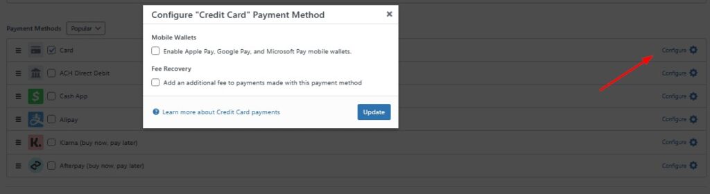 Next, for Payment Methods, choose the ones you want to offer your donors. If you’d like to offer Apple Pay / Google Pay, be sure to click on Configure and check the box. This is also where you can set up Fee Recovery to ensure you collect the total donation amount.