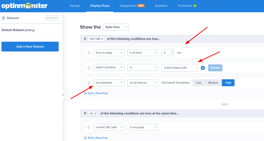 Next, from your dashboard, click on Display Rules. Here is where you can edit your exit intent and geolocation targeting rules. Be sure to save your changes when you’re finished.