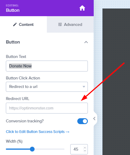 Simply click on the Donate Now button in the popup builder and enter the redirect URL. This URL needs to be the page on your site that you published your WP Simple Pay donation payment form on.