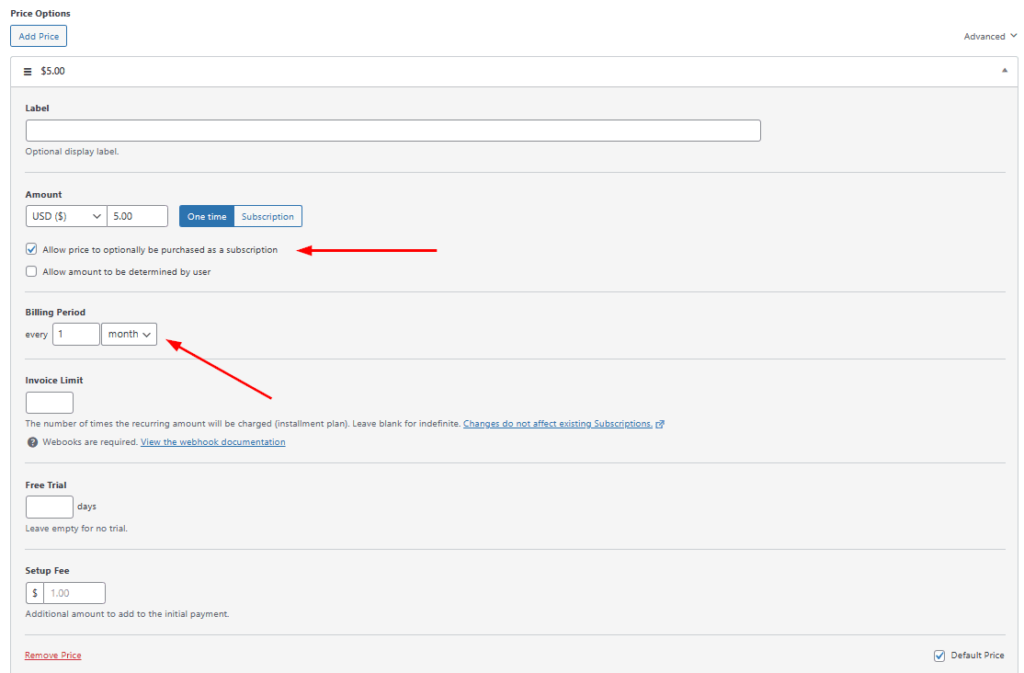 Check the box next to Allow price to optionally be purchased as a subscription for each price amount and choose month for the Billing Period.