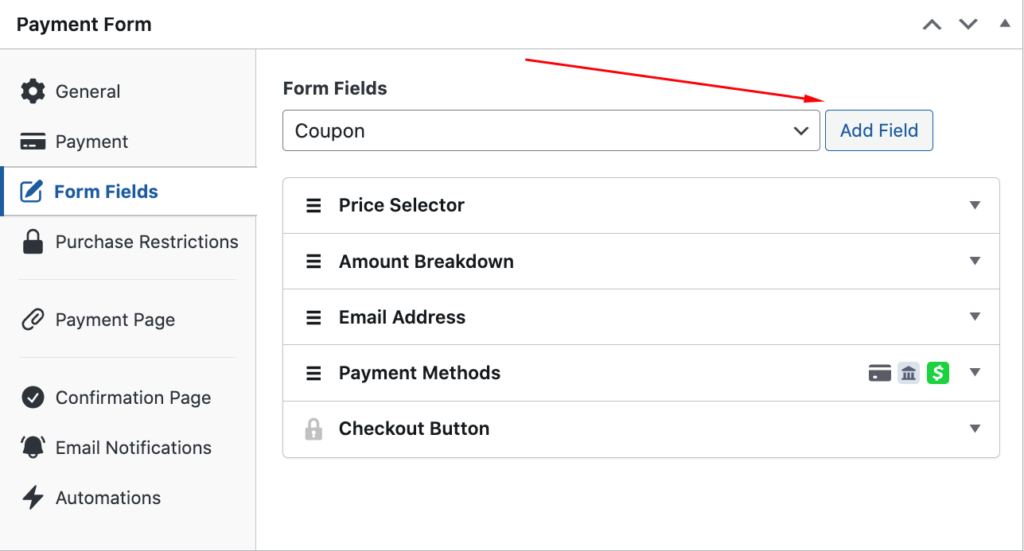 Now that you’re back in the payment form builder, click on the Form Fields tab and select Coupon from the drop down menu.
