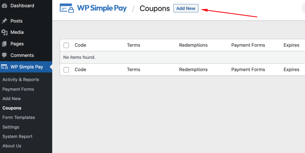 Simply navigate to the WP Simple Pay Coupons tab in your WordPress dashboard and click on Add New.