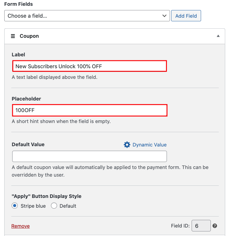 Next, add the label and placeholder text for your coupon field. You can also choose Stripe blue or Default for your button display style.