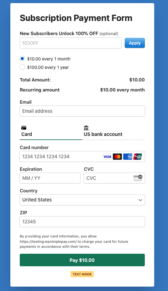 WP Simple Pay is the #1 Stripe payments plugin for WordPress that lets you easily accept recurring payments directly on your site without setting up a shopping cart system. The standalone plugin also enables you to create payment forms in minutes without coding.