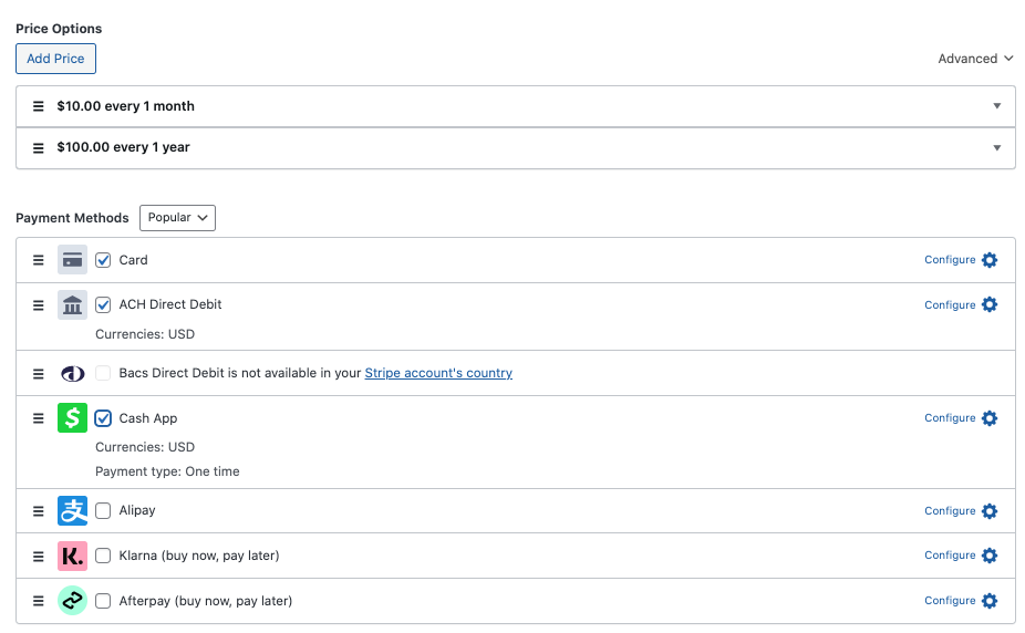 You can also choose which payment method options you want to offer your subscribers.