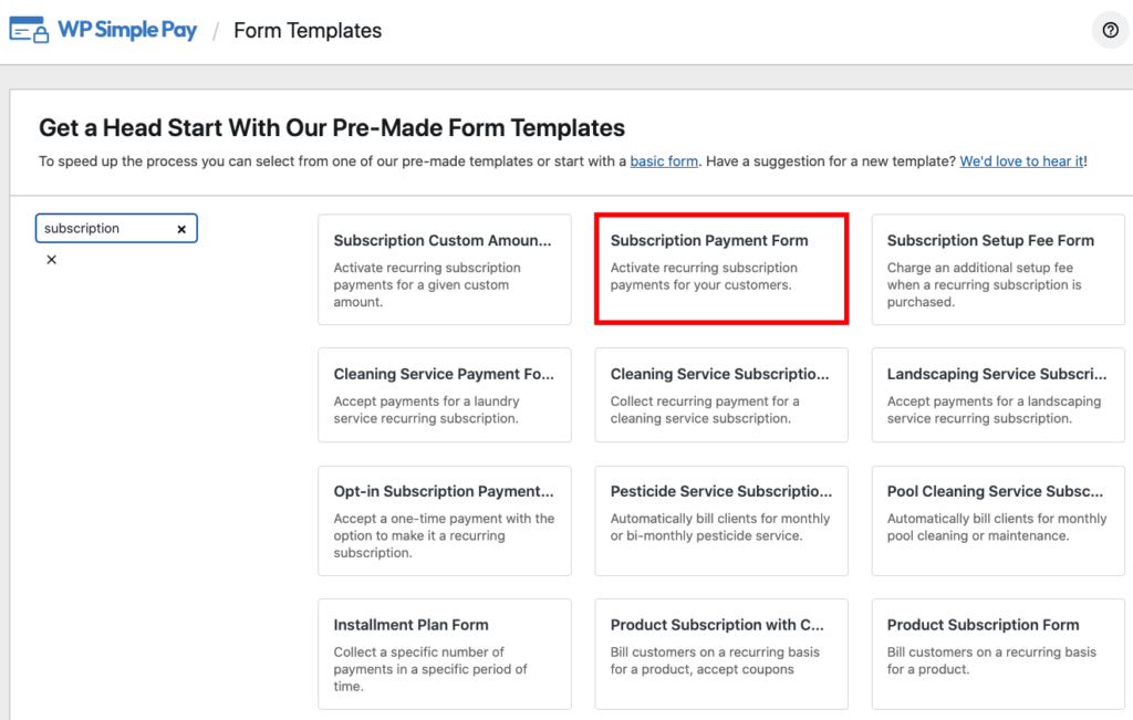 You should have been redirected to the pre-built form templates page, where you will see several options. Go ahead and choose the Subscription Payment Form template.