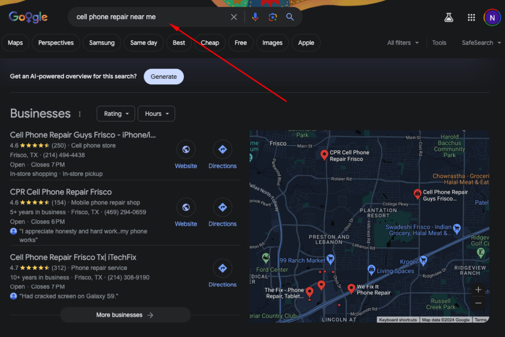 Creating a Google Business Profile makes your business more visible in Google search results. It appears on Google Maps like this: