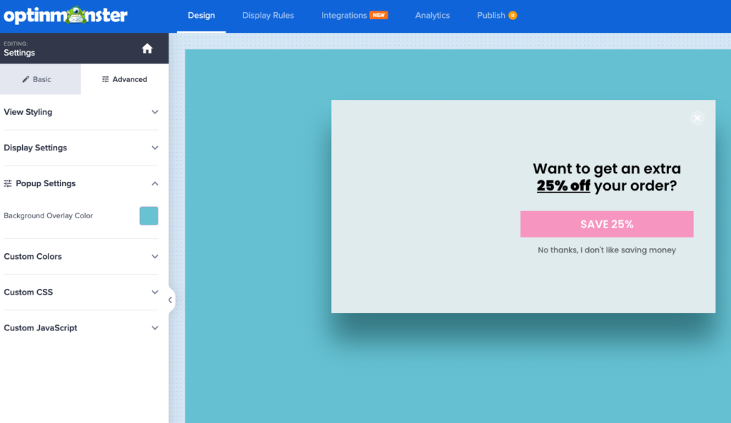 Now, you’ll be prompted to name your campaign and start editing the popup design. You’ll see many customization tools on the left-hand side. As you edit your campaign, you’ll see a live preview on the right-hand side. In this example, remove a few elements and add text that contains the coupon code SAVE25 for 25% off as we’ll be adding this coupon to our payment form later on.
