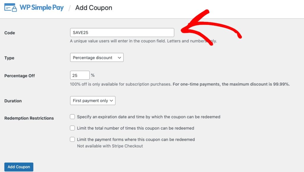 When you add a coupon code to WP Simple Pay, it also gets saved to your Stripe account.