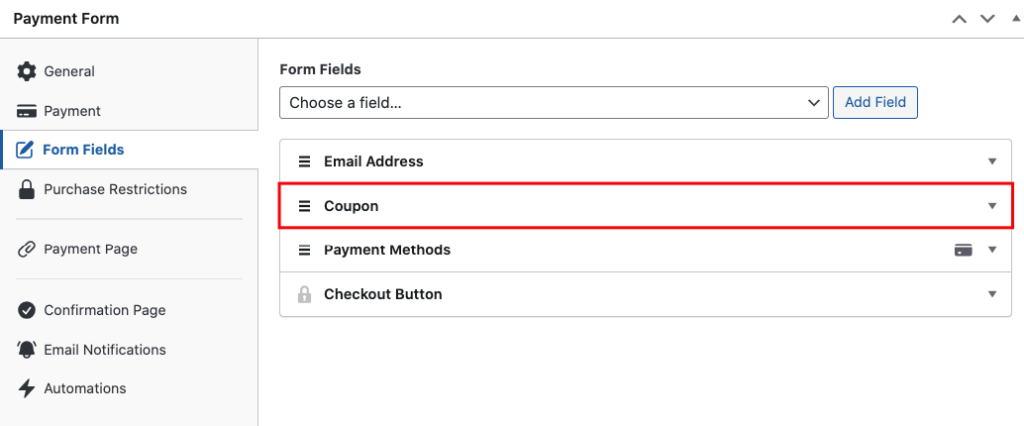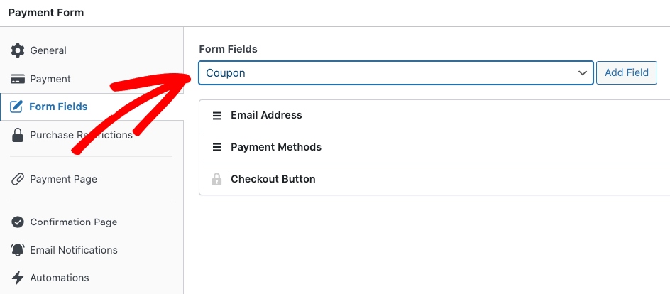While still editing the form, go to the Form Fields tab, select the Coupon field, then click Add Field.
