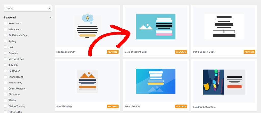 Next, choose a template from the available options. Go ahead and search for “coupon” and select the Get a Discount Code template for the purpose of this tutorial, but you could choose any template that appeals to you as they’re all simple to configure.