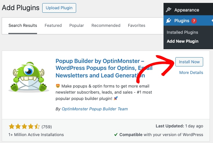Once you find the OptinMonster plugin, click Install Now, then click Activate.
