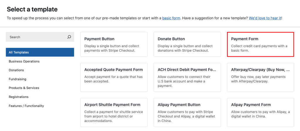 To create a payment form in your WordPress dashboard, select WP Simple Pay » Add New, and then choose the Payment Form template.