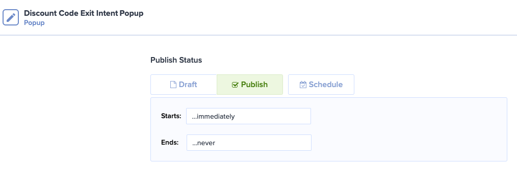 Now, click Save, click on the Publish tab, and then the Schedule tab, and click Save again. This will ensure that your exit intent popup is scheduled.