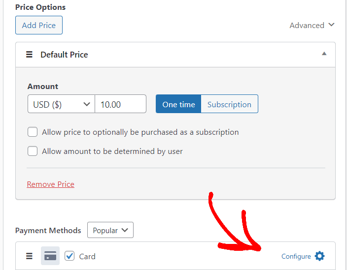 Now scroll down the page until you see Payment Methods. You can see different payment methods that are available in your Stripe account’s country. To remove the credit card processing fee, click the Configure option, next to Card. Now a modal popup will show up, which prompting you to add an additional fee to payment.