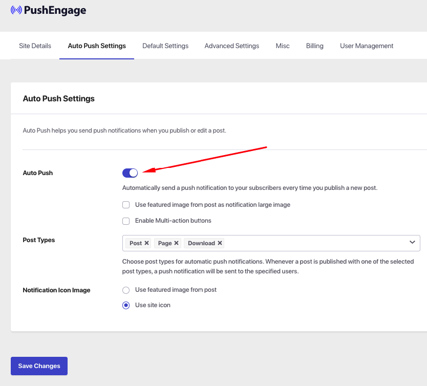 PushEngage also offers automatic push notifications, which can be enabled directly from the WordPress admin dashboard. Simply navigate to PushEngage » Settings » Auto Push Settings.