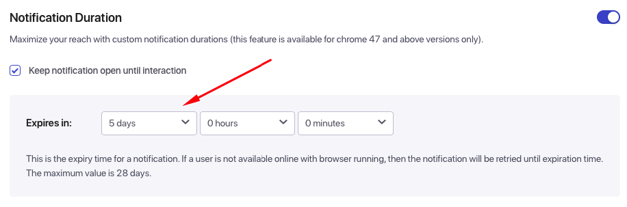 Next, set up your notification duration. This is simply how long the notification will remain active on your subscriber’s browser.
