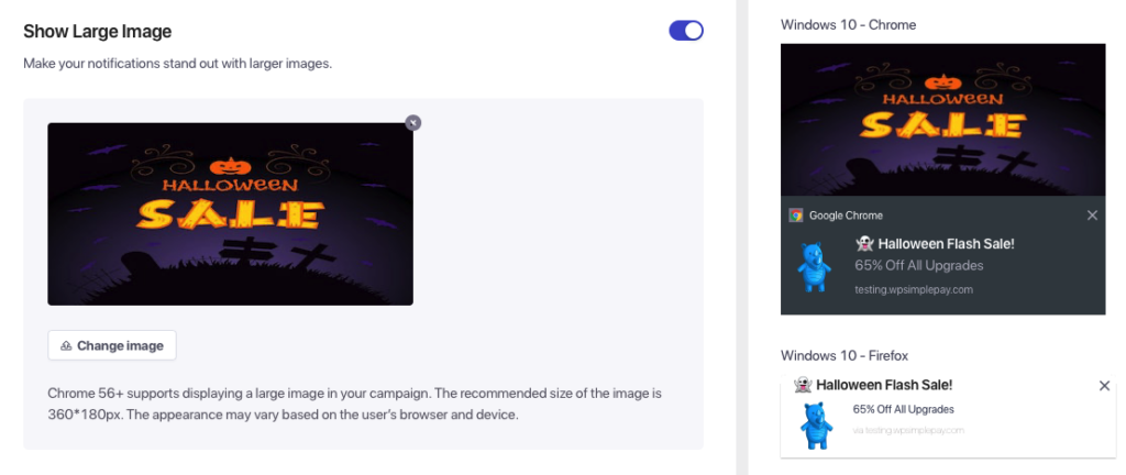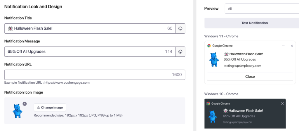 You’ll also notice that you can see a live preview of your notification on the right-hand side of the screen. It displays previews for Chrome, Firefox, iOS, and more.