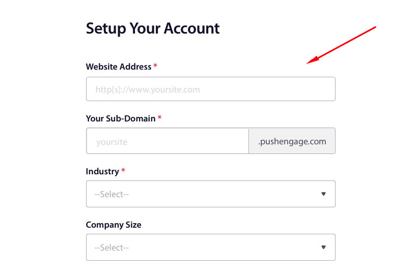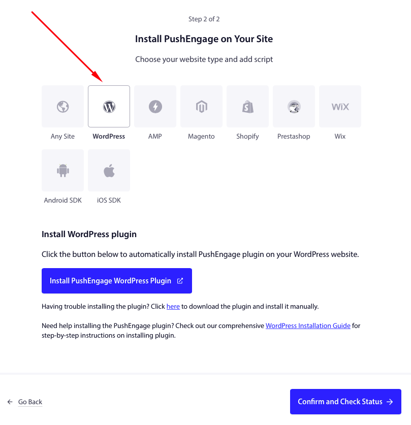 You’ll be asked to select WordPress as your website type and to install the PushEngage plugin on your site. Click on the Install PushEngage WordPress Plugin button.