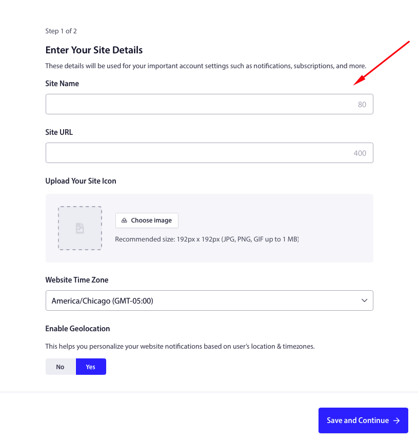 Once your site has been connected to your account, you’ll be directed to the onboarding page. Here is where you’ll need to enter your site name, URL, icon, and time zone. Also, it’s a good idea to toggle the switch to Enable Geolocation.