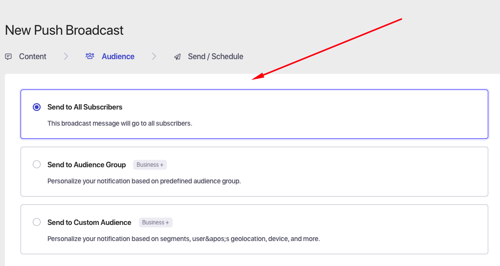 While PushEngage allows you to send your notifications to segmented groups and custom audiences, you’ll need to purchase a premium plan to do so.