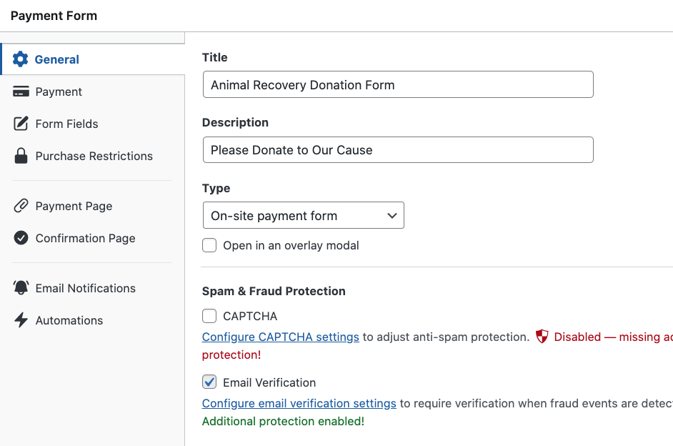 Next, in the General tab of the donation form builder, enter the title and description of your form and keep On-site payment form selected from the dropdown menu. This ensures that your donation form is embedded directly on your website.