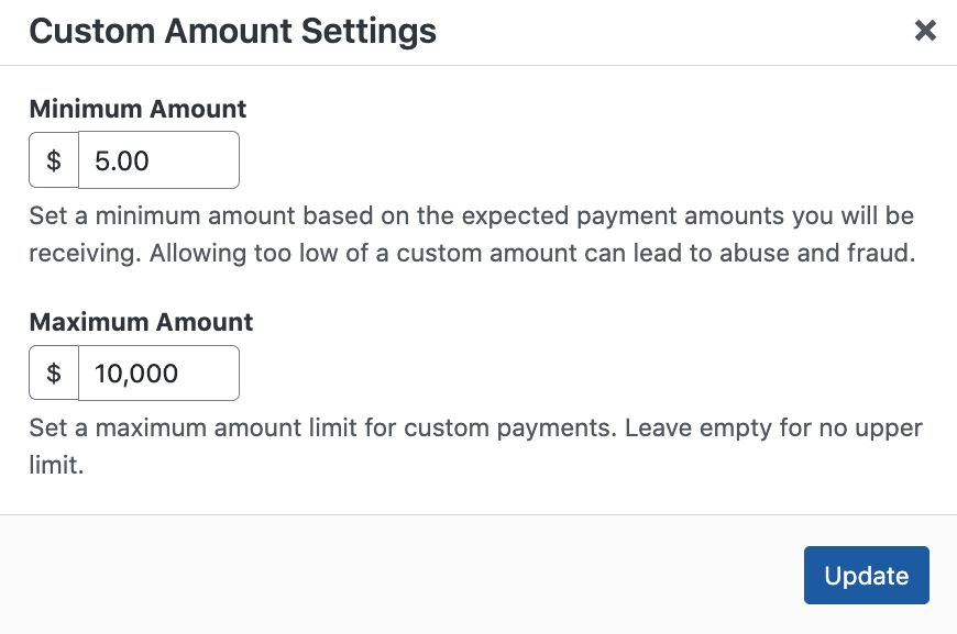 A box for Custom Amount Settings will appear. WP Simple Pay lets you enter a Minimum Amount in addition to a Maximum Amount for this price option. Go ahead and enter the amount you’d like to limit for custom payments in the field provided and click on Update.