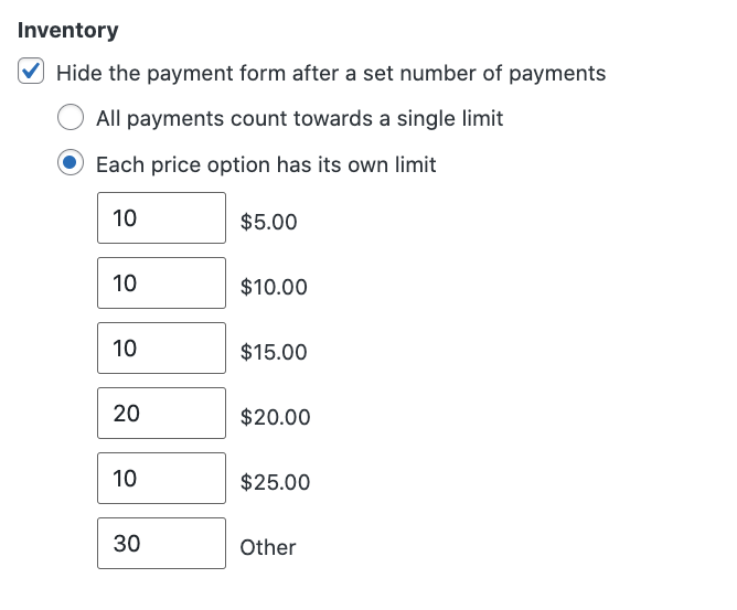 Simply check the box next to Hide the payment form after a set number of payments and enter the number of times each price can be used on this particular donation form.
