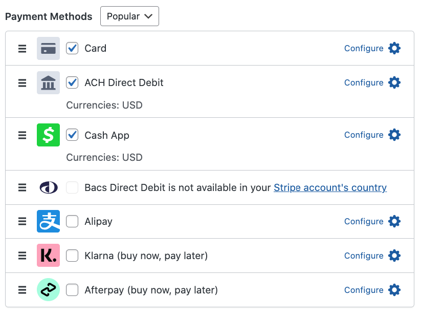 Be sure to scroll down the Payment page and choose the payment methods you want to accept. I’ve selected Card, ACH Direct Debit, and Cash App Pay.