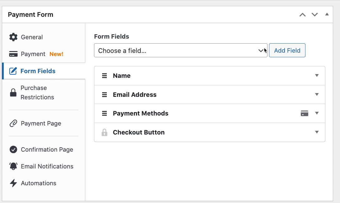 Now that you’ve added your price amount and the payment method options for your form, click on the Form Fields tab.