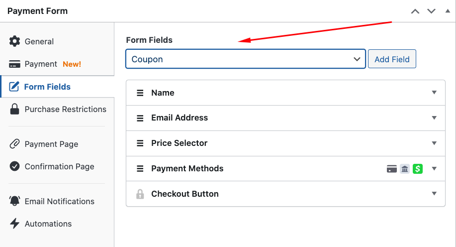 Simply navigate back to the Form Fields tab in the payment form builder and choose Coupon from the dropdown menu.