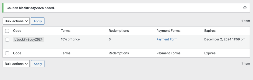 That’s it! The coupon code is active and can be used by customers when they use the payment form to complete their purchases.